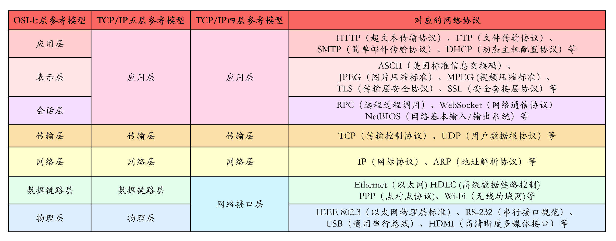 ISO七层模型、TCP/IP协议五层模型、TCP/IP协议四层模型之间的对应关系
